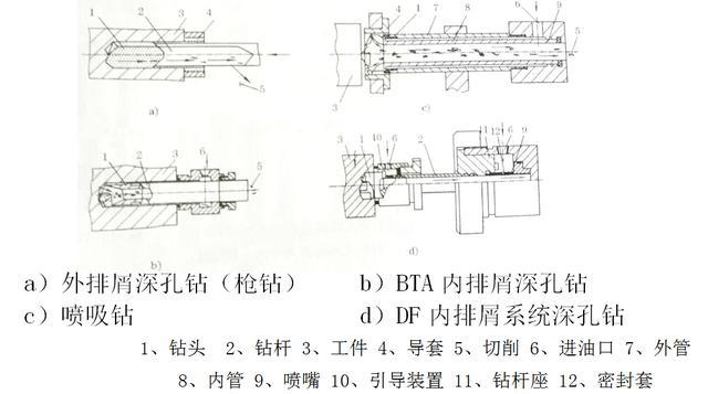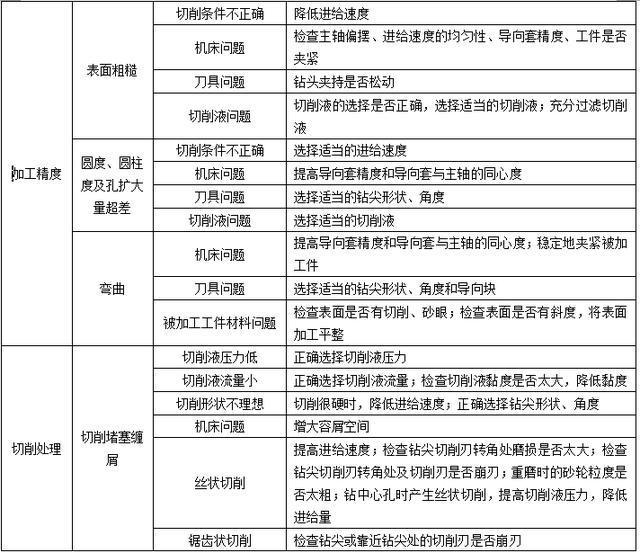 機加工中深孔鉆的選用要求1、深孔鉆(zhan)概念 在機械制造業中,一(yi)般將孔(kong)(kong)深(shen)超過孔(kong)(kong)徑10倍的圓柱孔(kong)(kong)稱為(wei)深(shen)孔(kong)(kong)。深(shen)孔(kong)(kong)按孔(kong)(kong)深(shen)與孔(kong)(kong)徑之比(bi)(L/D)的大小(xiao)通常可分(fen)為(wei)一(yi)般深(shen)孔(kong)(kong)、中等深(shen)孔(kong)(kong)及特殊深(shen)孔(kong)(kong)三(san)種。 1.1 L/D=10~20,屬于一(yi)般深(shen)孔。常在鉆床(chuang)或車床(chuang)上用接長麻花鉆加(jia)工(gong)。 1.2 L/D=20~30,屬(shu)于中等深(shen)孔。常在車(che)床(chuang)上加工。 1.3 L/D=30~100,屬于特殊深孔。必須使(shi)用深孔鉆在深孔鉆床或專用設(she)備(bei)上加(jia)工。 2、深孔加工難點 2.1 不能直接觀(guan)察(cha)到(dao)切削(xue)情況。僅憑聲音、看切削(xue)、觀(guan)察(cha)機床負荷、油(you)壓(ya)等參數(shu)來(lai)判斷排(pai)屑與鉆頭磨損情況。 2.2 切(qie)削熱不易傳出(chu)。 2.3 排屑較困難,如遇切(qie)削阻塞則(ze)會引(yin)起鉆(zhan)頭損(sun)壞。 2.4 因(yin)鉆桿(gan)長、剛性差、易(yi)振動,會導致(zhi)孔軸線易(yi)偏斜,影響到加工(gong)精度及(ji)生產效(xiao)率。 3、深孔(kong)鉆(zhan)的類型、使(shi)用(yong)范(fan)圍及工作原理 深(shen)孔(kong)(kong)鉆按排屑(xie)(xie)方(fang)式(shi)分為(wei)外(wai)排屑(xie)(xie)和(he)內(nei)排屑(xie)(xie)兩(liang)種(zhong),外(wai)排屑(xie)(xie)有槍鉆、整(zheng)體合金深(shen)孔(kong)(kong)鉆(可分為(wei)有冷卻孔(kong)(kong)和(he)無(wu)冷卻孔(kong)(kong)兩(liang)種(zhong));內(nei)排屑(xie)(xie)又(you)分為(wei)BTA深(shen)孔(kong)(kong)鉆、噴(pen)吸(xi)鉆和(he)DF系統深(shen)孔(kong)(kong)鉆三(san)種(zhong)。。 深孔鉆(zhan)的類型(xing)和使(shi)用范圍(wei)如下(xia)表,其結構(gou)及工作原理如下(xia)圖。 ![]() ![]() 4、深孔加工時的注意事(shi)項(xiang) 4.1 深(shen)孔加(jia)(jia)工(gong)操作(zuo)要點:主(zhu)軸與刀具(ju)導向套(tao)(tao)、刀桿支(zhi)(zhi)撐套(tao)(tao)、工(gong)件支(zhi)(zhi)撐套(tao)(tao)等中心(xin)線的(de)同軸度應(ying)符合要求;切削液系統(tong)應(ying)暢通正常(chang);工(gong)件的(de)加(jia)(jia)工(gong)端面上(shang)不應(ying)有中心(xin)孔,并避(bi)免(mian)在斜面上(shang)鉆孔;切削形狀(zhuang)應(ying)保持正常(chang),避(bi)免(mian)生成直帶狀(zhuang)切削;采用(yong)較高(gao)速度加(jia)(jia)工(gong)通孔,當鉆頭即將(jiang)鉆透時,應(ying)降速或停機以(yi)防損(sun)壞(huai)鉆頭。 4.2深(shen)孔(kong)(kong)加(jia)工(gong)(gong)切(qie)(qie)(qie)削(xue)液(ye)(ye)(ye):深(shen)孔(kong)(kong)加(jia)工(gong)(gong)過程(cheng)中(zhong)會(hui)產生大量的(de)(de)切(qie)(qie)(qie)削(xue)熱(re),并不易擴(kuo)散,需要(yao)供(gong)給充(chong)足的(de)(de)切(qie)(qie)(qie)削(xue)液(ye)(ye)(ye)潤滑冷卻刀具(ju)。一般選(xuan)用(yong)(yong)1:100的(de)(de)乳(ru)(ru)(ru)化液(ye)(ye)(ye)或極(ji)壓乳(ru)(ru)(ru)化液(ye)(ye)(ye);需要(yao)較高(gao)加(jia)工(gong)(gong)精(jing)度(du)(du)(du)和(he)(he)表面質量或加(jia)工(gong)(gong)韌性材(cai)料時(shi),選(xuan)用(yong)(yong)極(ji)壓乳(ru)(ru)(ru)化液(ye)(ye)(ye)或高(gao)濃度(du)(du)(du)極(ji)壓乳(ru)(ru)(ru)化液(ye)(ye)(ye),切(qie)(qie)(qie)削(xue)油(you)(you)的(de)(de)運動粘度(du)(du)(du)通(tong)常選(xuan)用(yong)(yong)(40℃)10~20cm2/s,切(qie)(qie)(qie)削(xue)液(ye)(ye)(ye)流速(su)為(wei)(wei)15~18m/s;加(jia)工(gong)(gong)直徑(jing)較小時(shi)選(xuan)用(yong)(yong)黏度(du)(du)(du)低的(de)(de)切(qie)(qie)(qie)削(xue)油(you)(you);要(yao)求精(jing)度(du)(du)(du)高(gao)的(de)(de)深(shen)孔(kong)(kong)加(jia)工(gong)(gong),可選(xuan)用(yong)(yong)切(qie)(qie)(qie)削(xue)油(you)(you)配(pei)比為(wei)(wei)40%極(ji)壓硫化油(you)(you)+40%煤油(you)(you)+20%氯化石蠟。切(qie)(qie)(qie)削(xue)液(ye)(ye)(ye)的(de)(de)壓力(li)和(he)(he)流量與孔(kong)(kong)徑(jing)及加(jia)工(gong)(gong)方(fang)式有著密切(qie)(qie)(qie)的(de)(de)關系,具(ju)體參考(kao)下表: ![]() 4.3 使用深孔鉆注意事項 4.3.1 工(gong)件端(duan)面(mian)與工(gong)件軸心線垂直,以(yi)保證端(duan)面(mian)密封可靠(kao)。 4.3.2 正(zheng)式加工前在(zai)工件(jian)孔位(wei)上預鉆一個淺孔,引鉆時可起導向定心作(zuo)用。 4.3.3 為保證刀(dao)(dao)具使用壽命(ming),最(zui)好采(cai)用自(zi)動(dong)走刀(dao)(dao)。 4.4.4 進液器、活(huo)動中心(xin)支撐中的各導向(xiang)元(yuan)件(jian)如(ru)有磨損,應及(ji)時更換(huan),以免影響鉆孔精度(du)。 5、深孔(kong)加工(gong)中的故障及其排除措施 ![]() ![]()